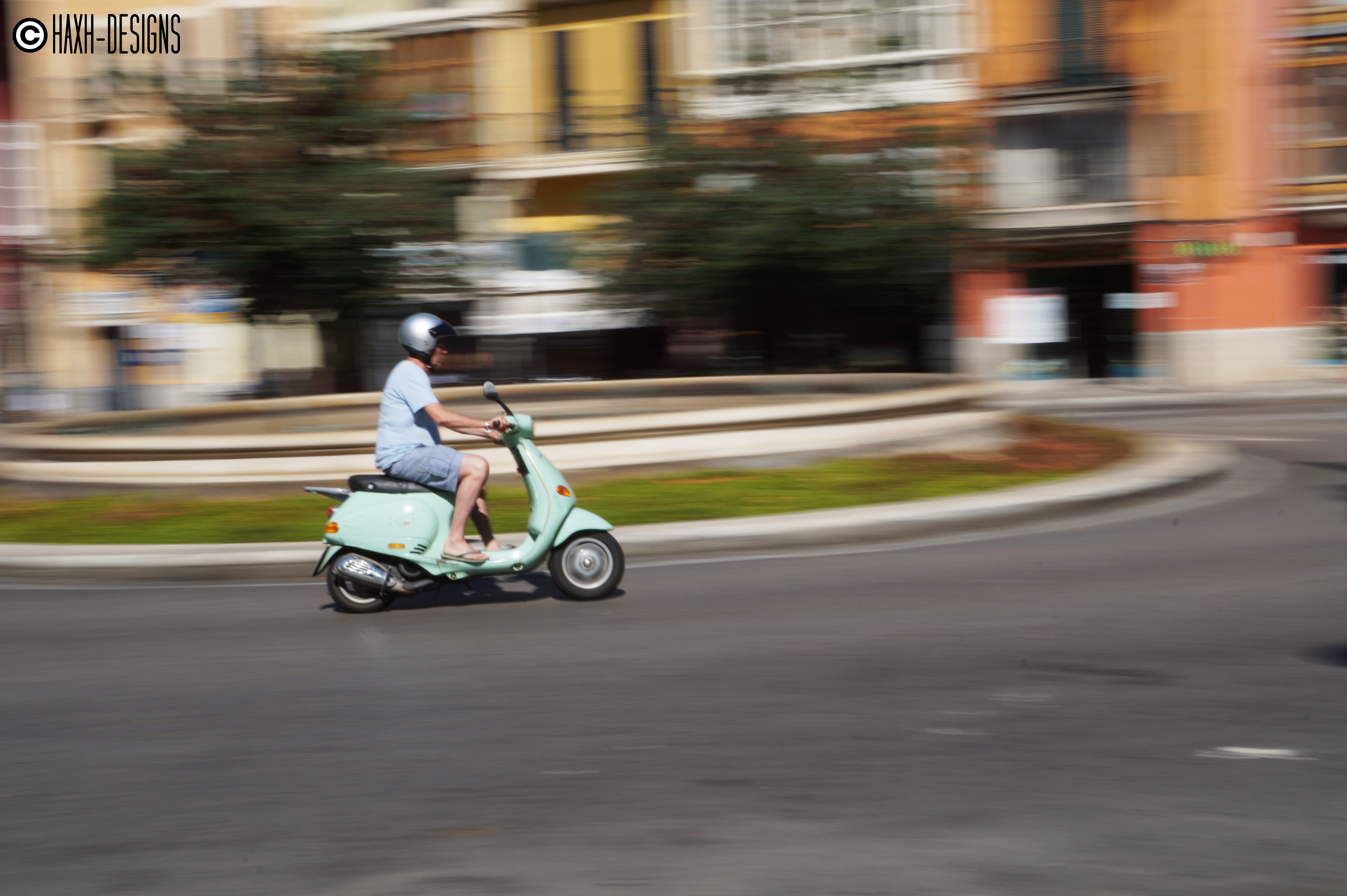 En primer lugar, y una de las primeras fotos que hago con esta práctica, os traigo una motocicleta «Vespa» durante uno de sus muchos días «laborales». Para ser la primera fotografía en movimiento (es decir, siguiendo el objeto enfocado con la lente de la cámara) debo admitir que el enfoque no es perfecto. Pese a ese pequeño problema, la foto se merece un puesto aquí en HaxhDesigns.
